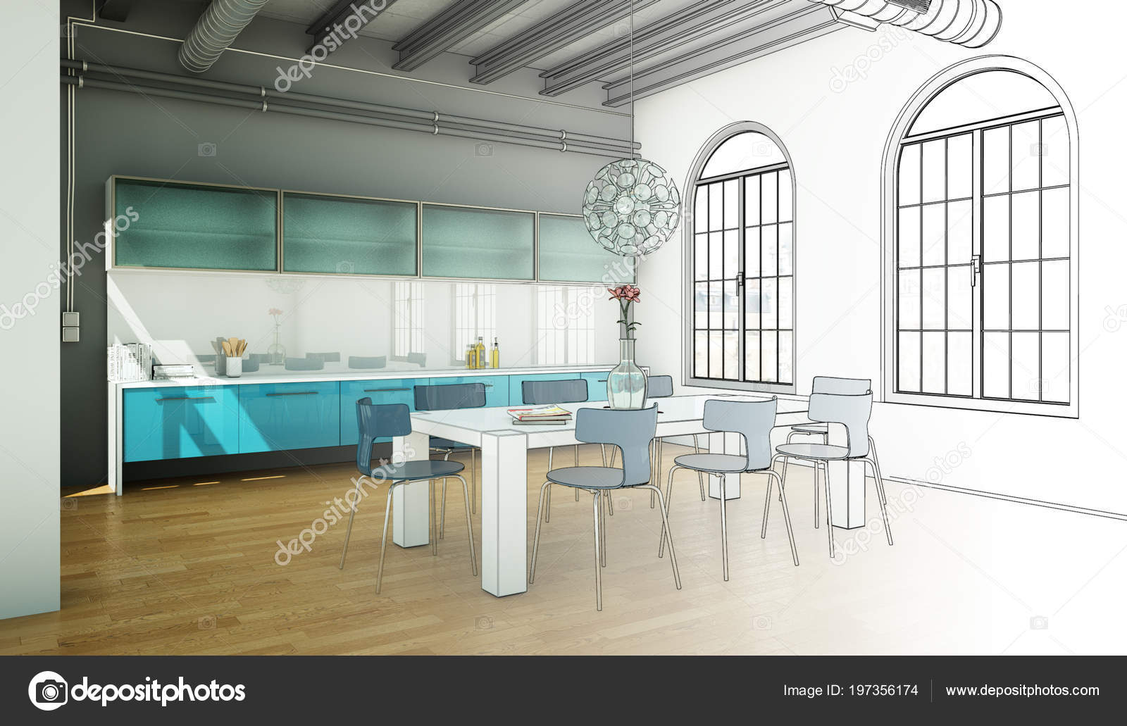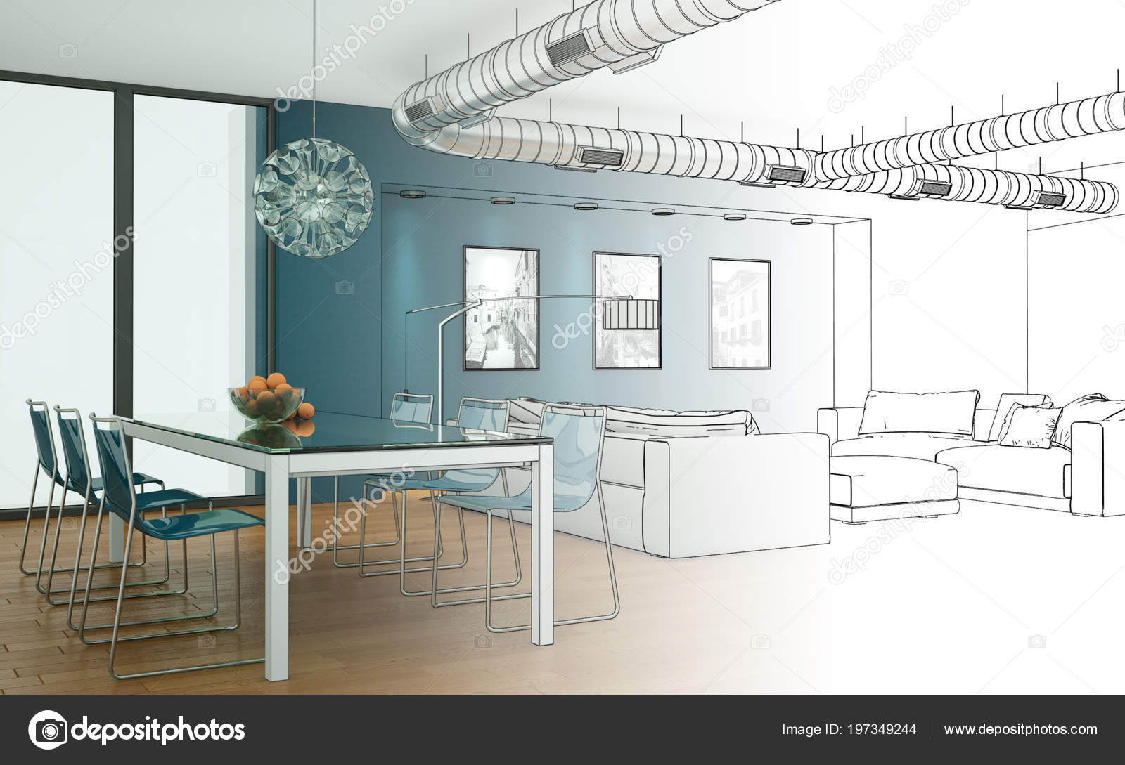 Interior Design Modern Loft Drawing Gradation Into Photograph 3d Illustration Stock Photo Picture And Low Budget Royalty Free Image Pic Esy 044358215 Agefotostock